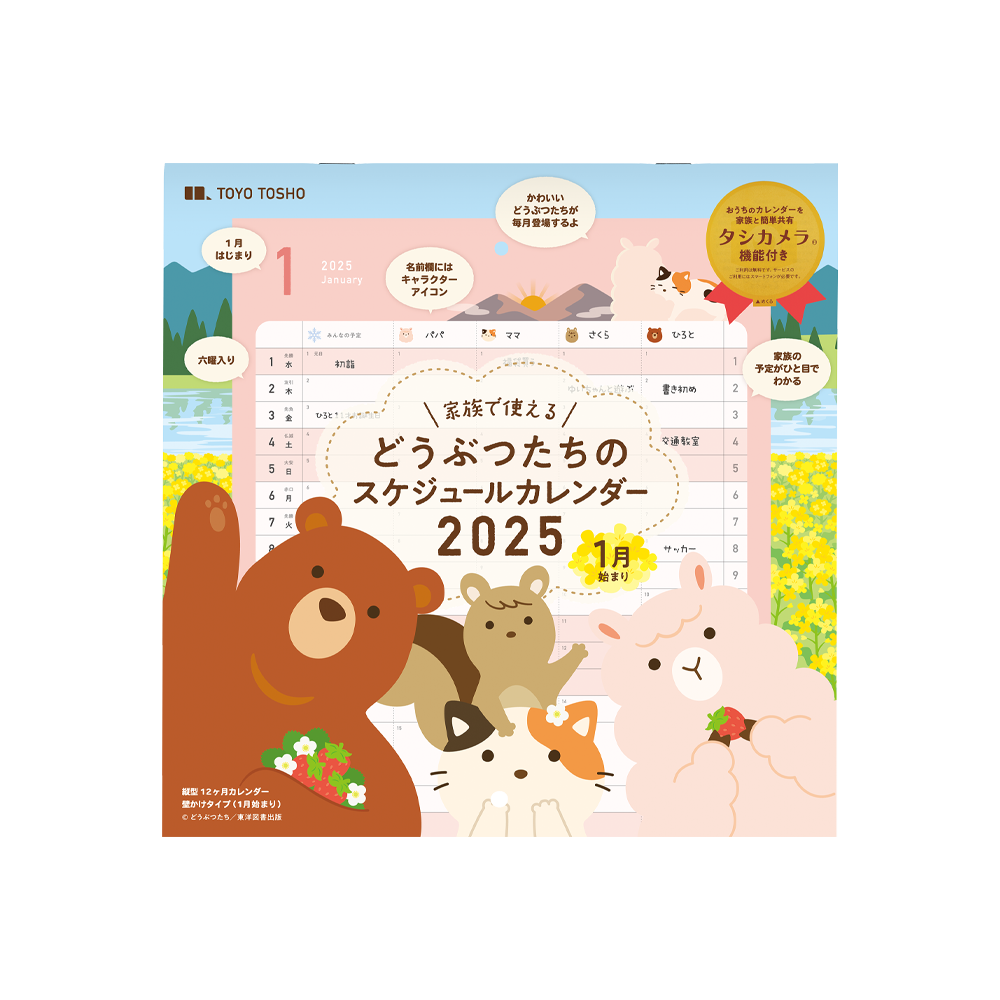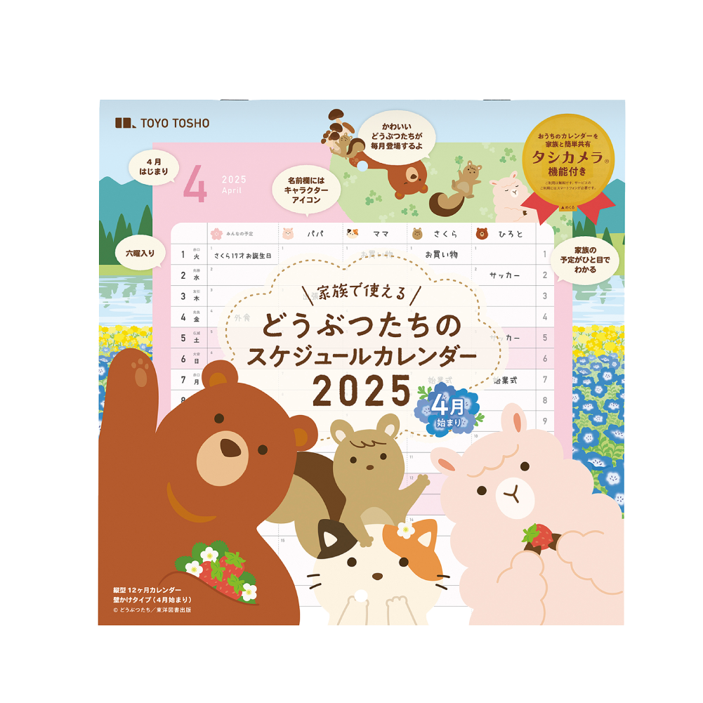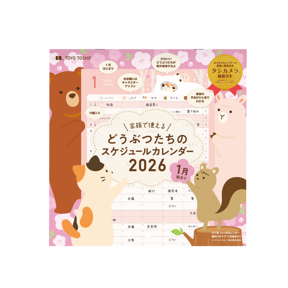 4ひきのどうぶつたちがかわいい壁掛けスケジュールカレンダーです。家族とカレンダーがスマートフォンで共有できるタシカメラアカウント付き。