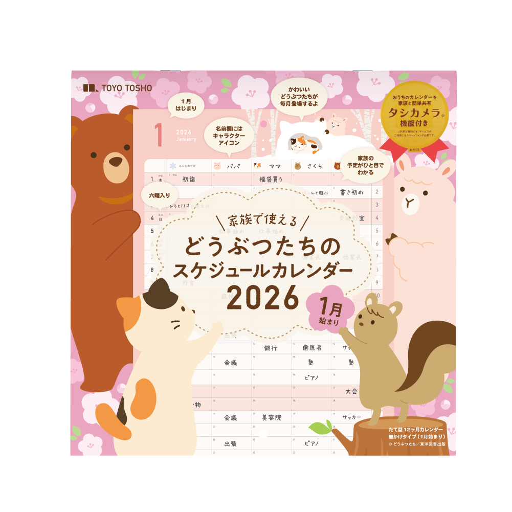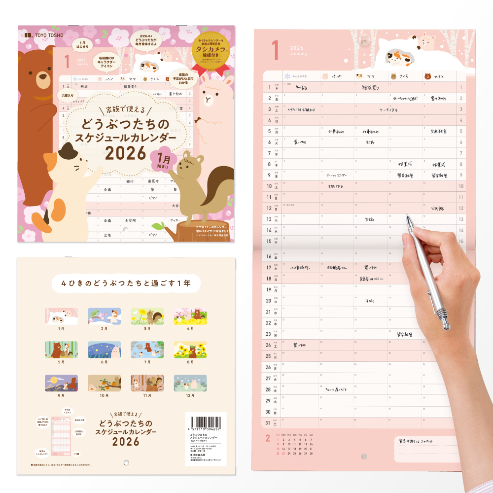 毎月めくるのが楽しみになる、壁掛けタイプのスケジュールカレンダー。季節のイベントにあわせた、どうぶつたちの表情やしぐさに癒されます。