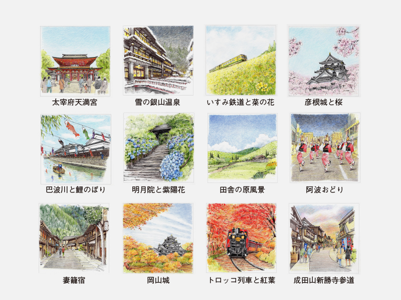 1月 太宰府天満宮/2月 雪の銀山温泉/3月 いすみ鉄道と菜の花/4月 彦根城と桜/5月 巴波川と鯉のぼり/6月 明月院と紫陽花/7月 田舎の原風景/8月 阿波おどり/9月 妻籠宿/10月 岡山城/11月 紅葉とトロッコ列車/12月 成田山新勝寺参道