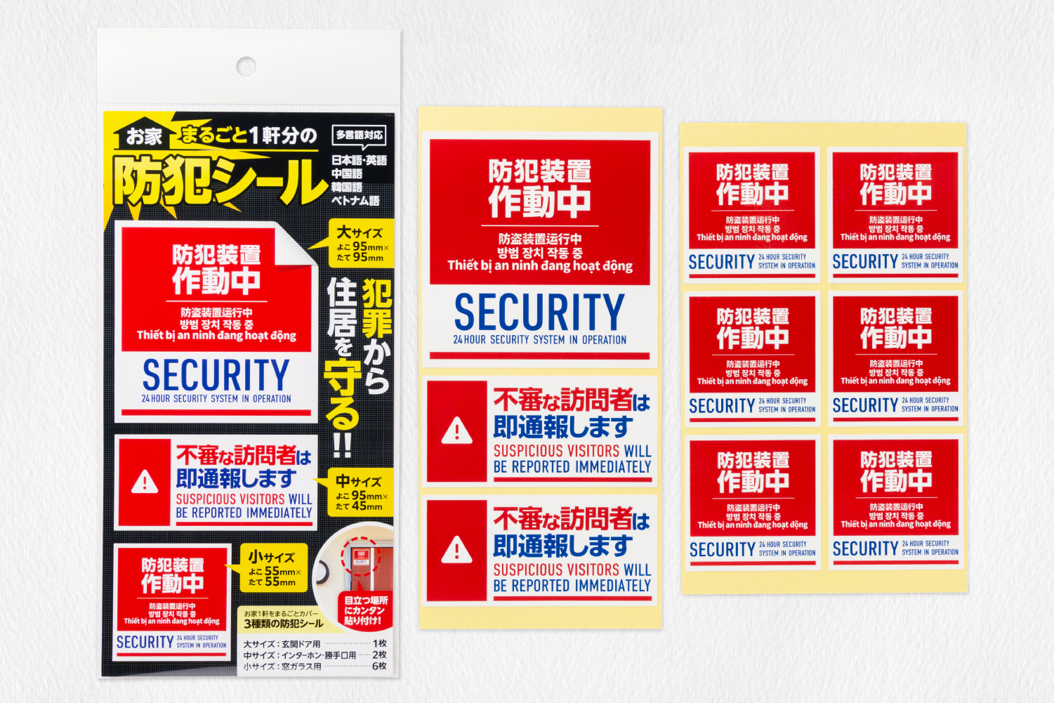 玄関や窓に貼れる3種計9枚がセットになっており、住宅全体をカバーして侵入を抑止。
