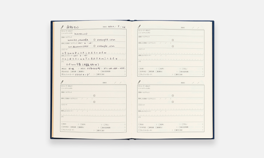 サービスやSNSのパスワードをまとめて管理。保存性に優れたハードカバー仕上げ。