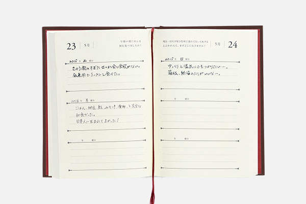 - 曜日なし問いかけ付き日記記入欄(365頁) ハードカバー・表紙PP加工・しおり紐付き