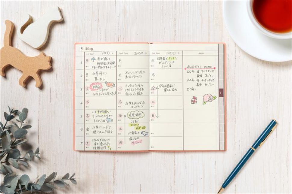3年使えるひとこと記録手帳は、曜日を書き込むタイプで、いつからでも使い始められる3年連用手帳です。