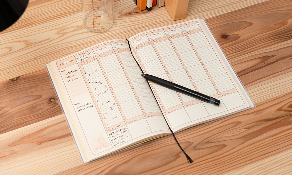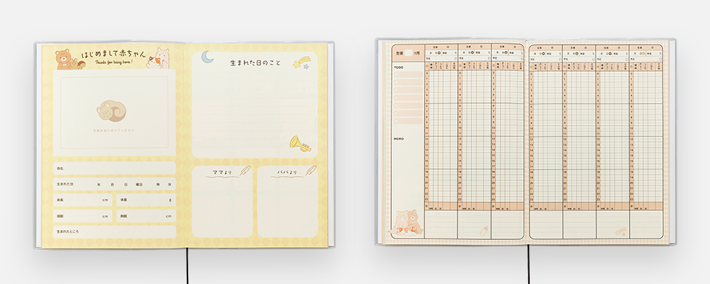 忙しいお母さんが育児日記を机の上に開いたまま置いておけるよう、製本方法を従来の無線とじからPUR製本に変更しました。パタンと180度に開けたままらくらく記入ができます。