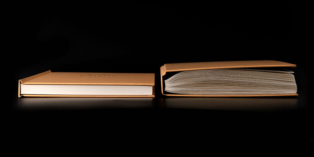MIHIRAKI ALBUMの最大の特長は製本方法です。ハードカバーなのに開きやすく、ページに写真や紙を貼り付けても本が膨らみにくいその秘密は新構造の製本方法にあります。MIHIRAKI ALBUMの製本方法は、背開き上製本を採用しており、本文が厚くなってきても、その厚みに合わせて背幅が広がっていきます。そのため、写真を貼り付けても、表紙が開いてしまうことなく、美しいままお使いいただけるのです。