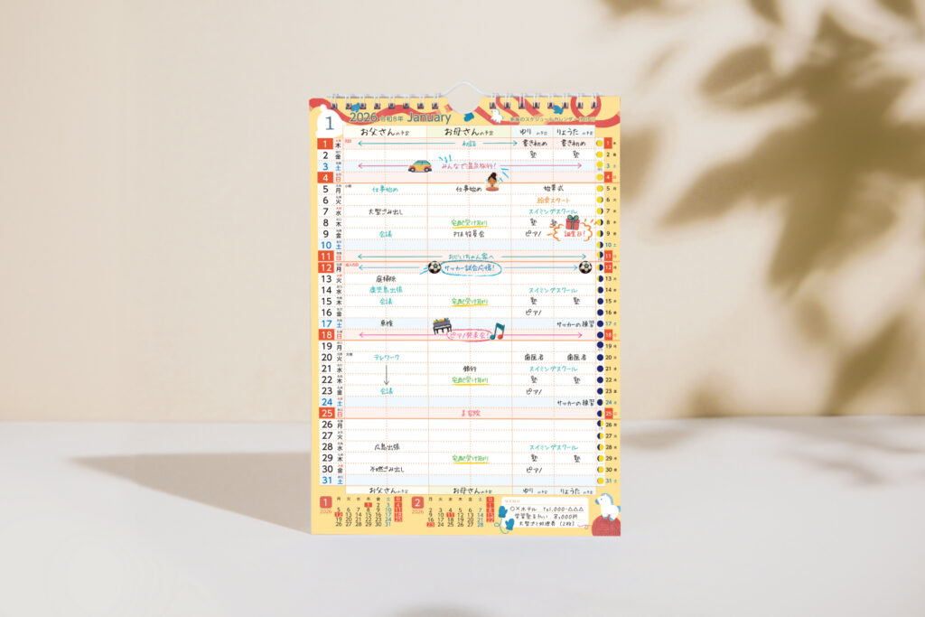 コンパクトながらも使いやすさ抜群の1冊。デスクにも壁にもフィットするサイズ感で、限られたスペースでも大活躍します。家族の予定をまとめるだけでなく、自分専用のタスク管理カレンダーとしてもおすすめです。